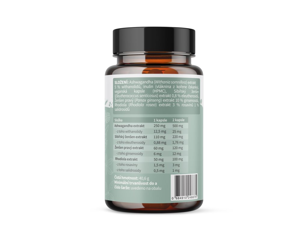 Tiež máte pocit, že v dnešnej uponáhľanej dobe už nemáte ani štipku pokoja? Možno je načase to zmeniť. S touto kombináciou prírodných adaptogénov a superpotravín si pomôžete ku kvalitnému spánku, duševnej pohode a ľahšiemu zvládaniu stresu. | 60 kapsúl, 30-60 dávok