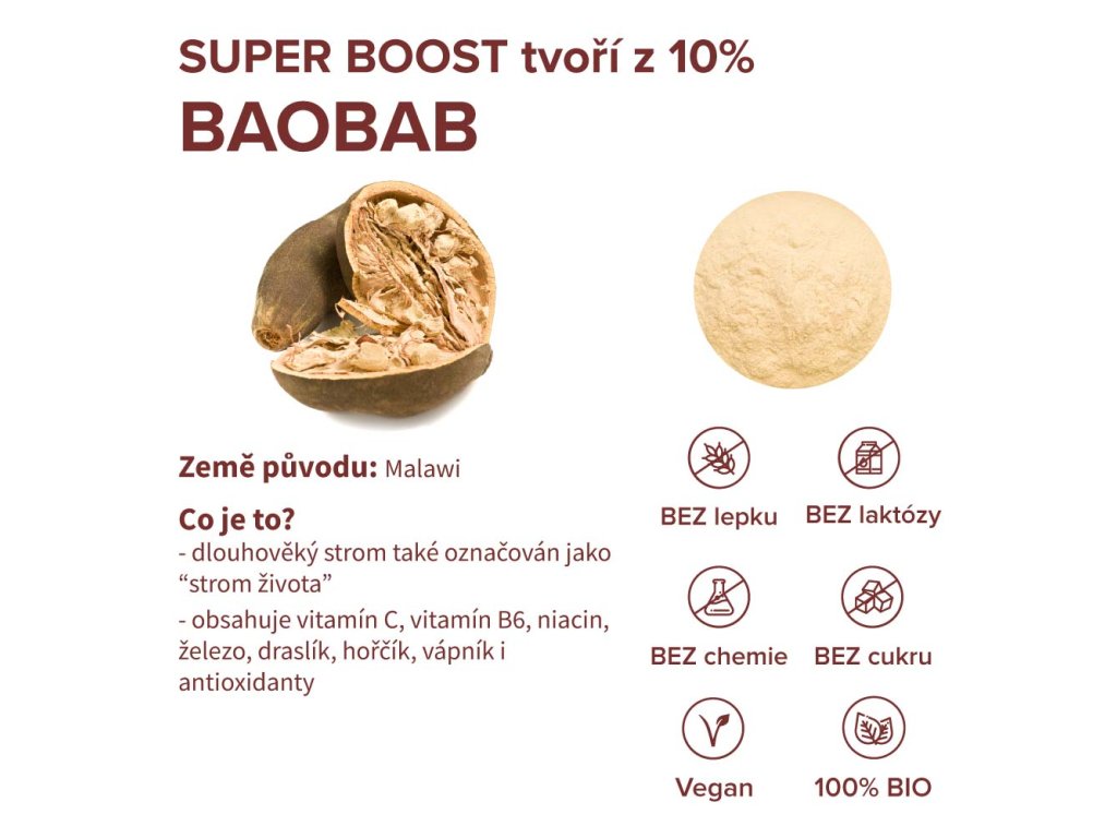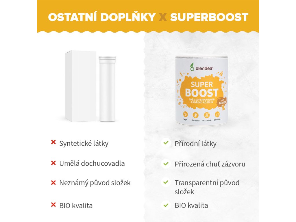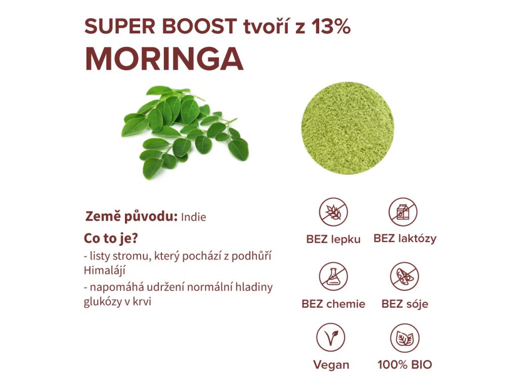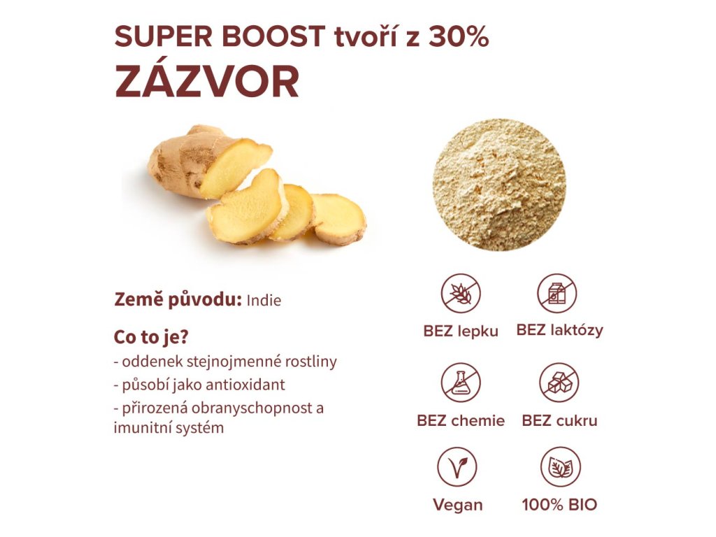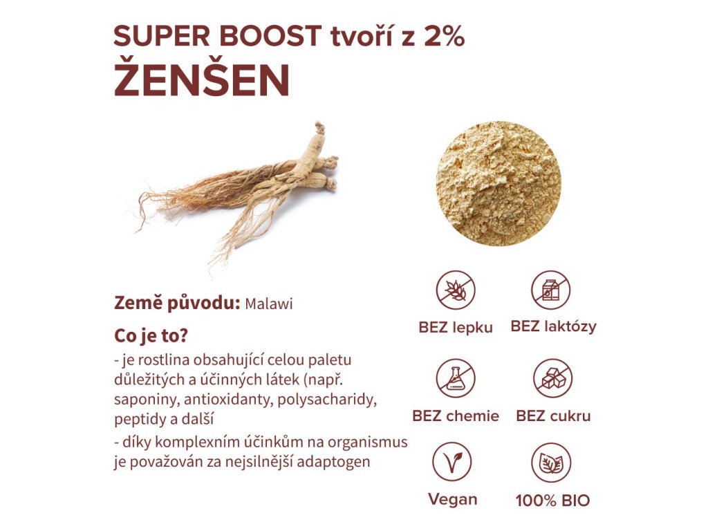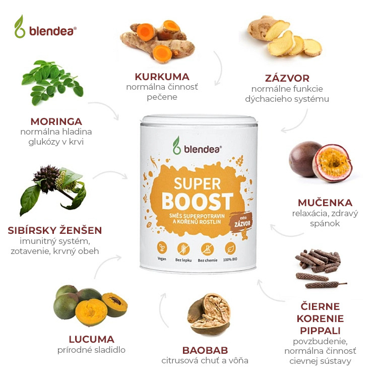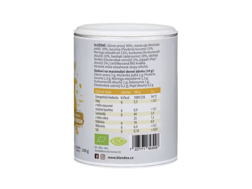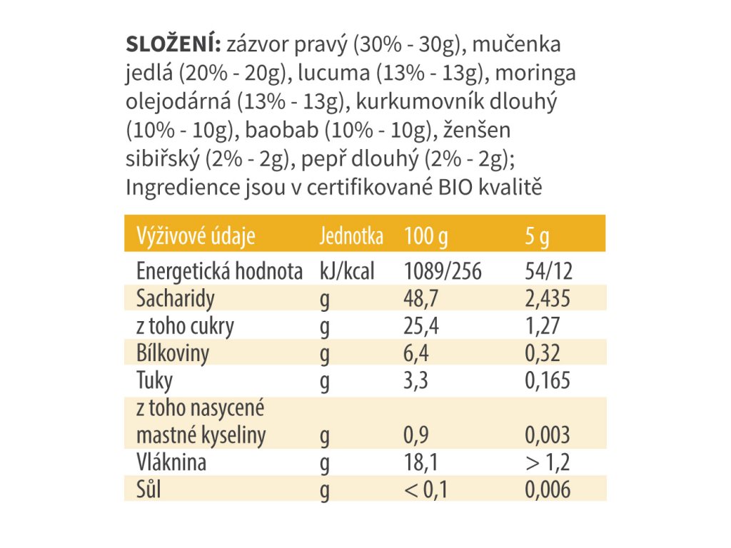 Zmes BIO superpotravín ženšen, moringa, zázvor, kurkuma a ďalších pre podporu imunity, dýchacieho systému a krvného obehu. Má výraznú zázvorovú chuť a po vypití príjemne zahreje organizmus. | 100 g, 20 dávok