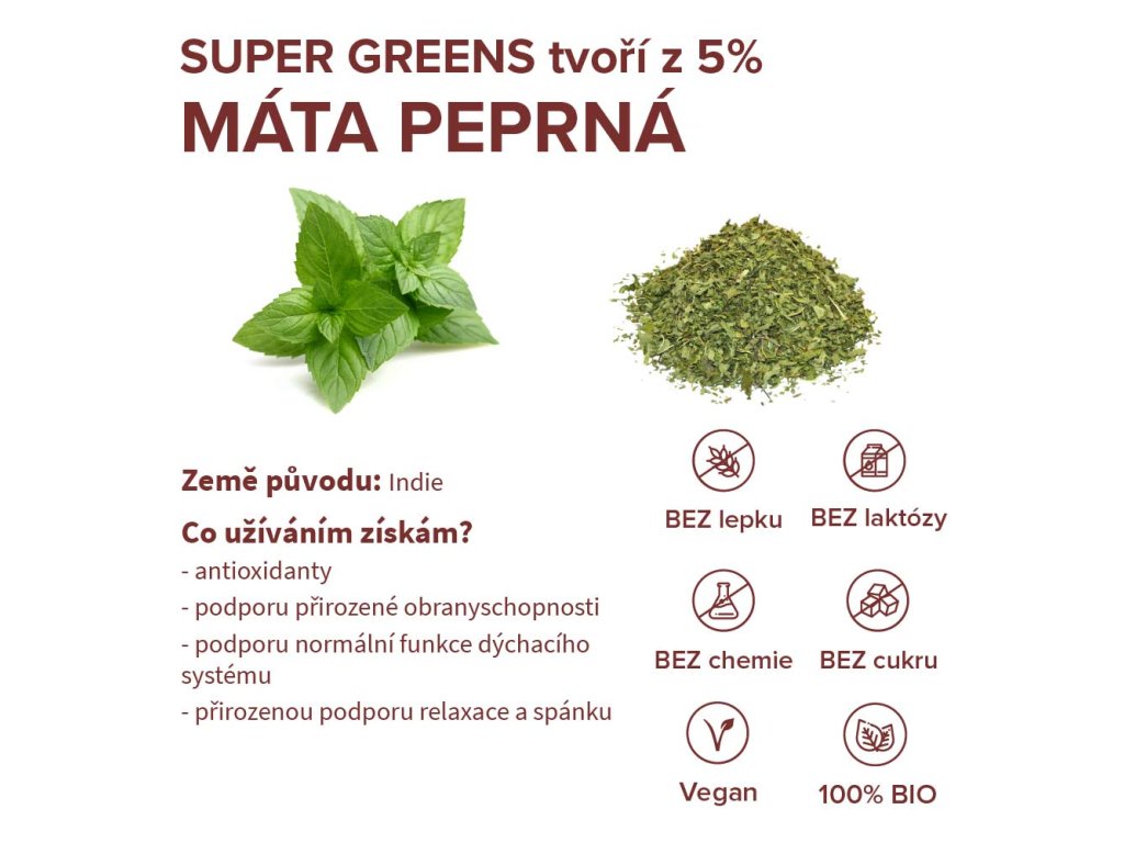 Spirulina, chlorella, zelený jačmeň, mladá pšenica a štipka mäty v dokonale vyváženej kombinácii pre podporu trávenia, imunity, kvality pleti a celkovej vitality organizmu. | 90 g, 30 dávok