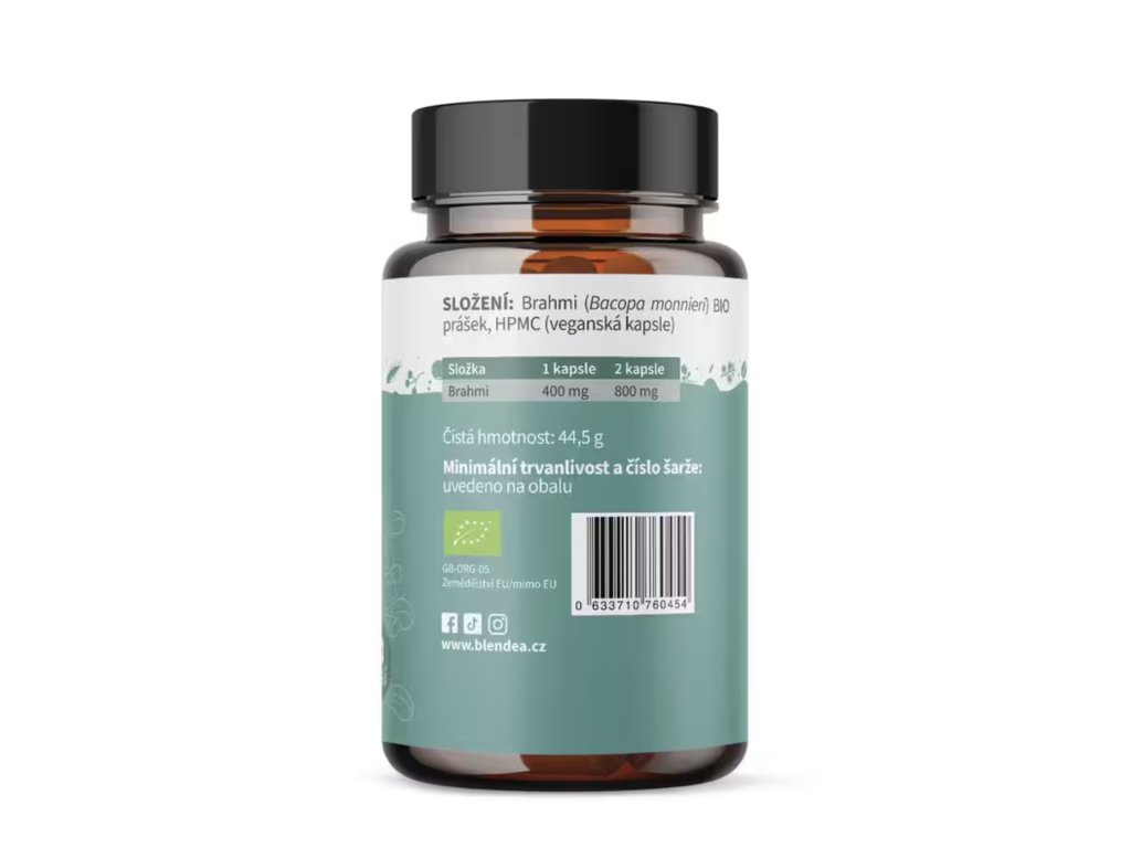 Brahmi (Bacopa monnieri) podporuje činnosť mozgu, zlepšuje koncentráciu, pamäť a duševnú výkonnosť. Pôsobí ako rastlinný adaptogén a pomáha telu lepšie zvládať stres a únavu. Zároveň podporuje pokojný spánok a celkovú duševnú rovnováhu.