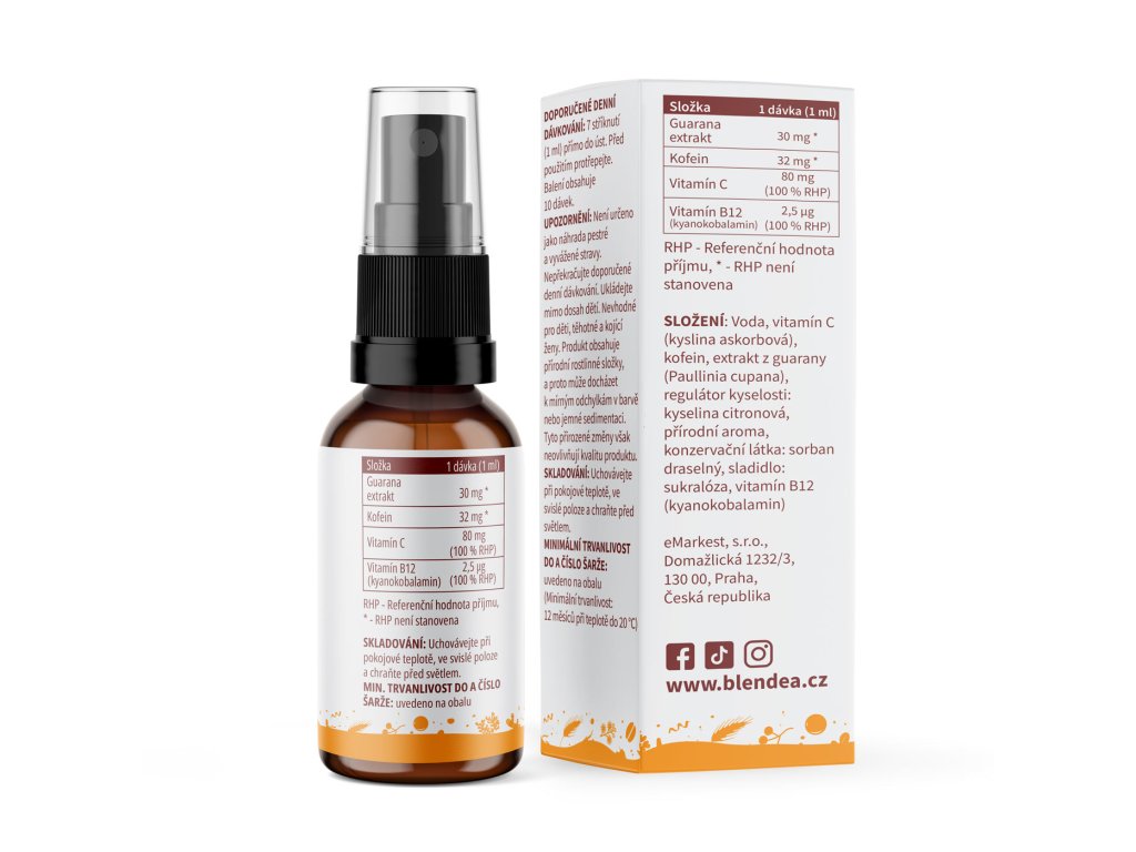 Keď potrebujete okamžitú vzpruhu, Blendea Energy Boost Sprej nakopne telo aj myseľ vďaka kombinácii guarany, kofeínu, vitamínu B12 a Céčka. Praktická ampulka a účinok do niekoľkých minút. Vhodné pre dni, kedy chýba energia a nemôžete si ani na chvíľku ľahnúť. | 10 dávok