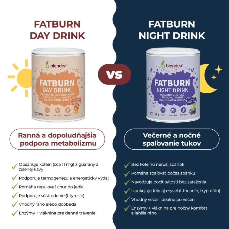 Komplexný balíček instantných nápojov Blendea Fat Burn pre podporu metabolizmu a spaľovania tukov vo dne aj v noci. Dve funkčné zmesi sa dopĺňajú a pomáhajú organizmu efektívnejšie využívať energiu aj počas spánku.