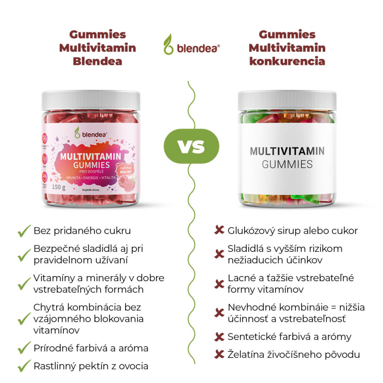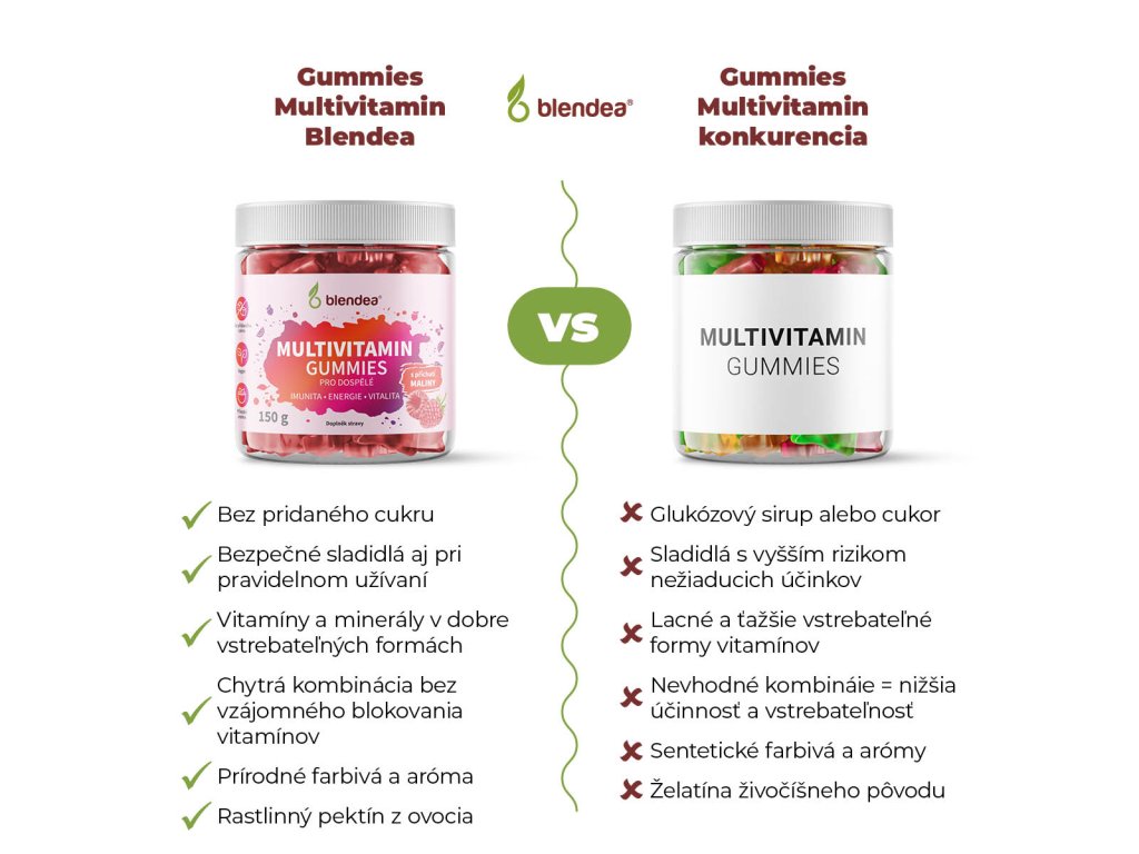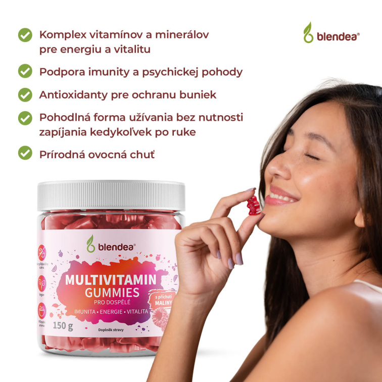 Vyskúšajte multivitamínové Gummies Blendea, sladké želé cukríky s malinovou príchuťou a vyváženou kombináciou vitamínov a minerálov pre podporu imunity, energie a vitality. Samozrejme úplne bez pridaného cukru. | 30 dávok