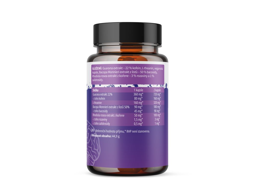 Vyvinuli sme vyváženú kombináciu bylín a kofeínu: guarana pre povzbudenie, bacopa a rhodiola pre podporu pamäti a sústredenia. L-theanín pre vyváženie stimulačných účinkov ostatných zložiek a udržanie pokojnej mysle bez nervóznej roztržtitosti. | 60 dávok