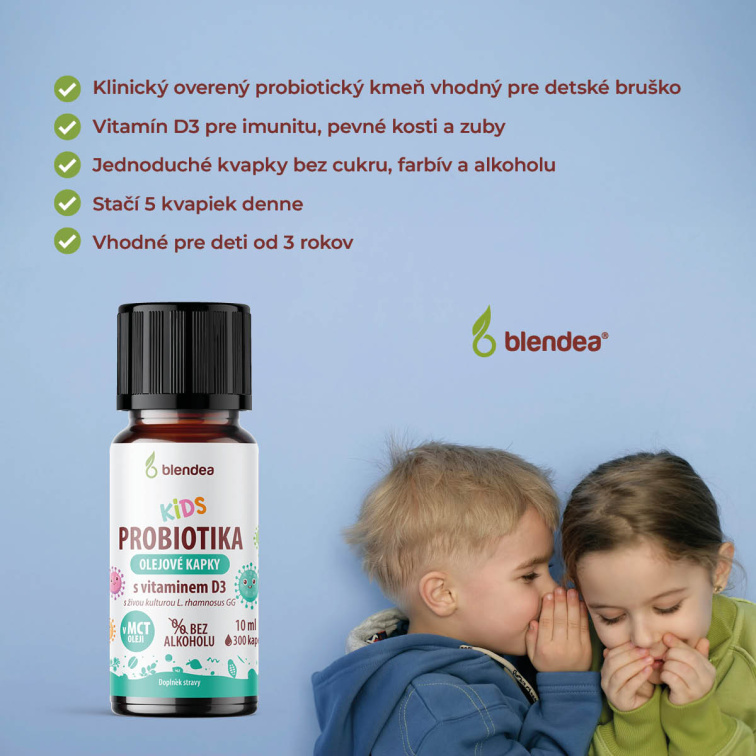 Blendea Kids Probiotiká s vitamínom D3 v olejových kvapkách sú spoľahlivý pomocník pre detské bruško aj imunitu. Kvapky kombinujú živé kultúry z kmeňa Lactobacillus rhamnosus GG s vitamínom D3 v praktickej forme. Jedna fľastička obsahuje 60 dávok a je určená pre deti už od 3 rokov. | 10 ml