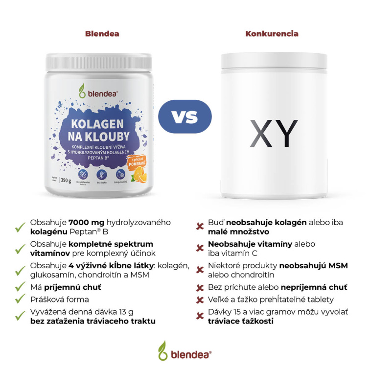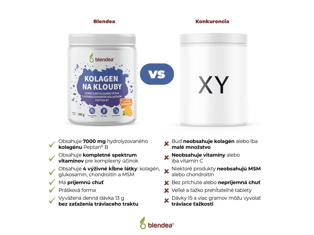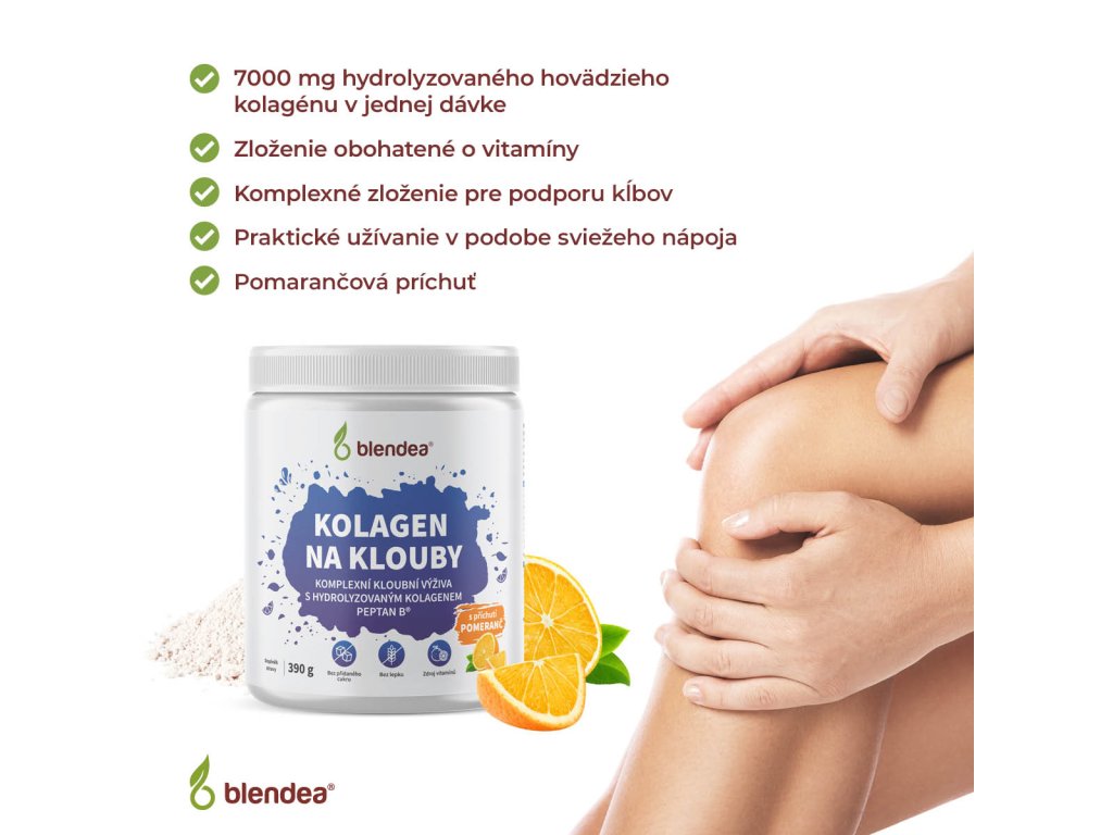 Kĺbna výživa, na ktorú sa môžete spoľahnúť. Starostlivosť o kĺby začíná zvnútra. Instantný nápoj Blendea Kolagén na kĺby s komplexným zložením je ideálnou voľbou. Ocenia ho nielen aktívni športovci, ale aj ľudia, ktorých kĺby sú namáhané každodennou záťažou pri práci, koníčkoch, pri bežnom pohybe aj s pribúdajúcim vekom. | 30 dávok, 390 g