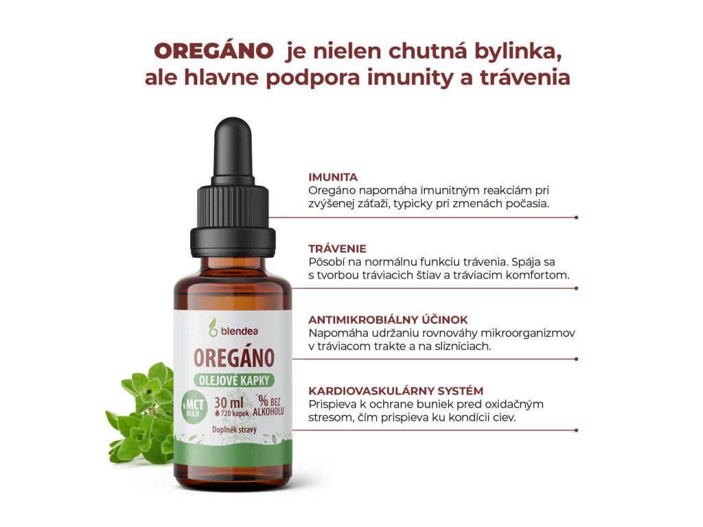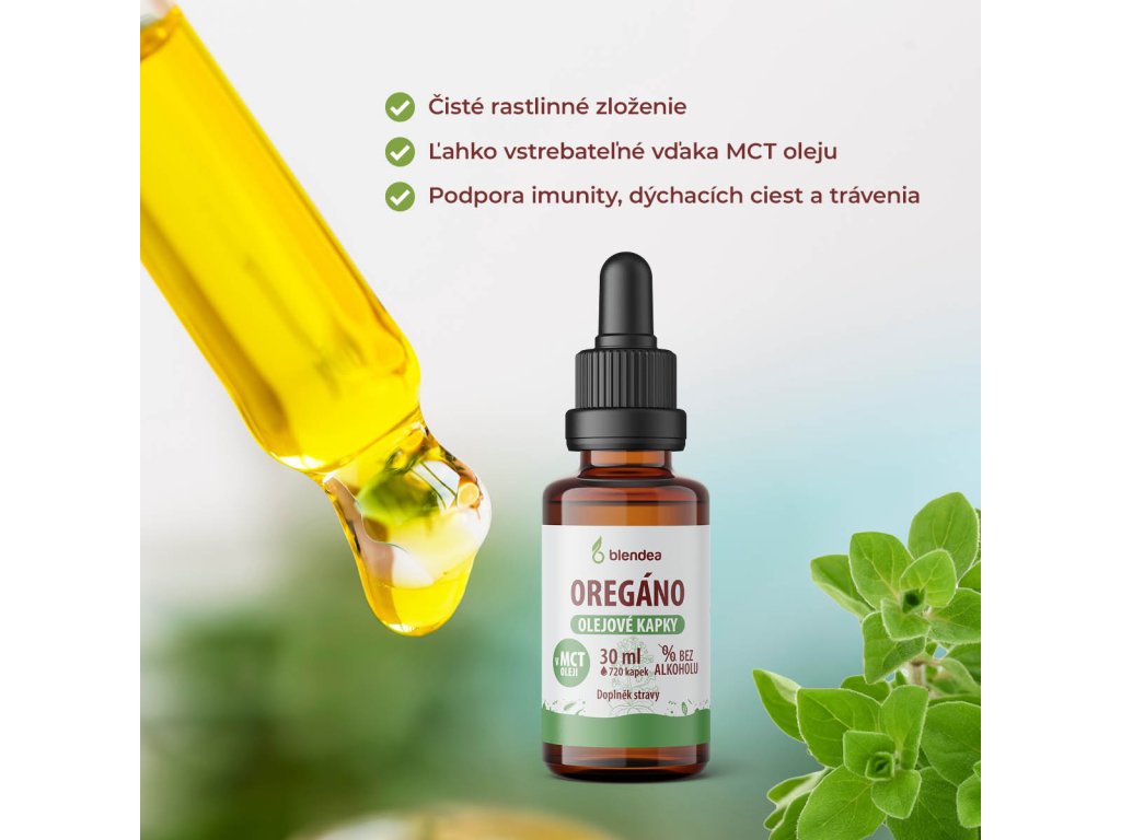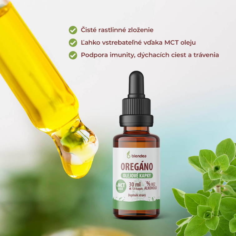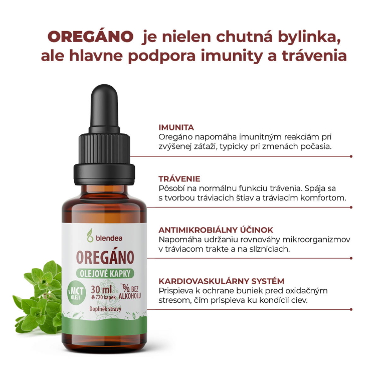 Oregáno nepatrí iba do kuchyne. Jeho silu a prospešné účinky využívali už v starovekom Grécku. Extrakt z Pamajoránu obyčajného sa tradične využíva pre podporu trávenia a prirodzenej obranyschopnosti organizmu. V Blendea sme oregáno spracovali do praktických olejových kvapiek bez alkoholu. | 720 kvapiek, zhruba 30 dávok