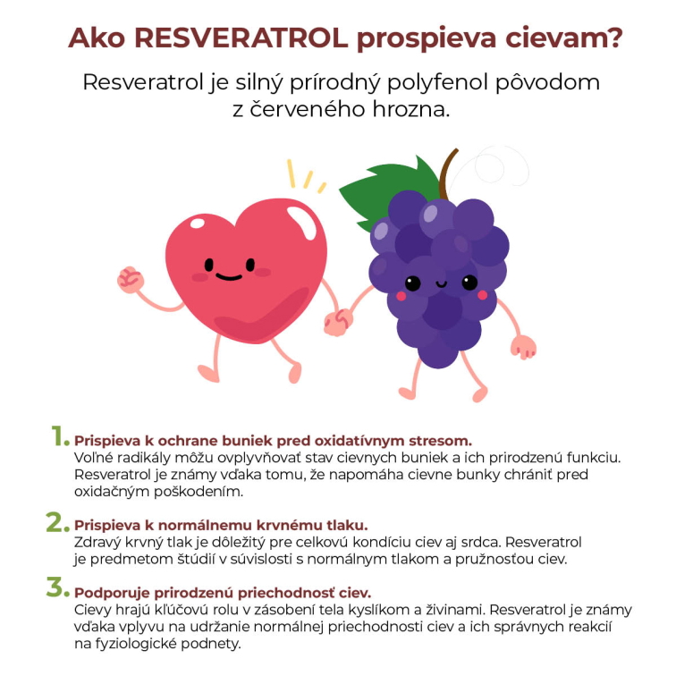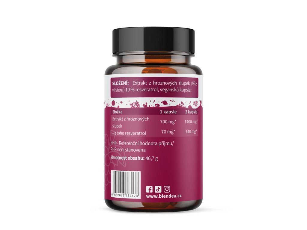 Kapsuly obsahujú prírodný antioxidant resveratrol, ktorý pomáha chrániť bunky pred predčasným starnutím vplyvom oxidačného stresu aj tlaku uponáhľaného moderného životného štýlu. | 60 kapsúl, 30-60 dávok