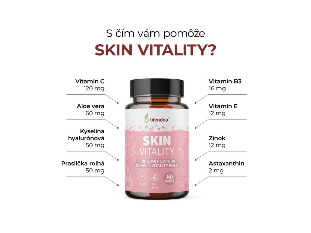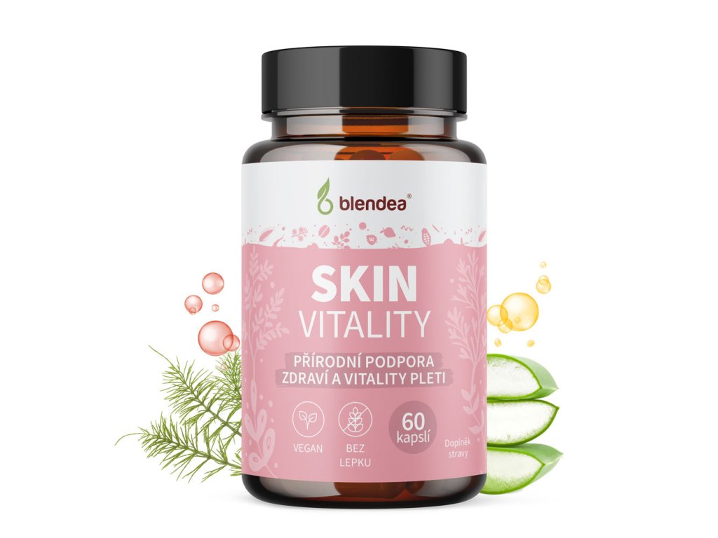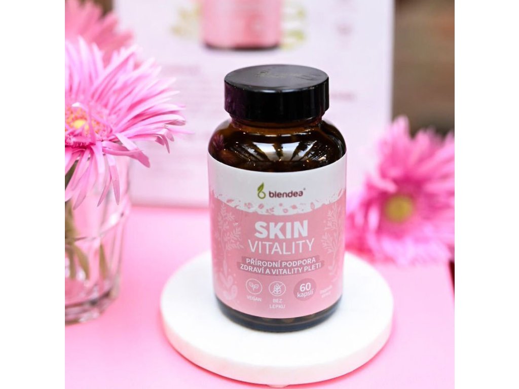 Blendea Skin vitality obsahuje 8 funkčných a 100% prírodných zložiek, ktoré podporujú zdravie pleti, chránia ju pred oxidatívnym stresom a prispievajú k prirodzenej tvorbe kolagénu. | 60 kapsúl, 30-60 dávok