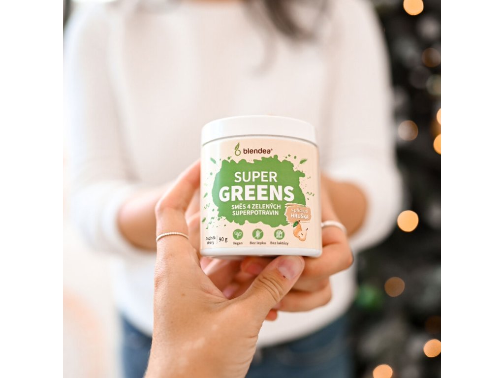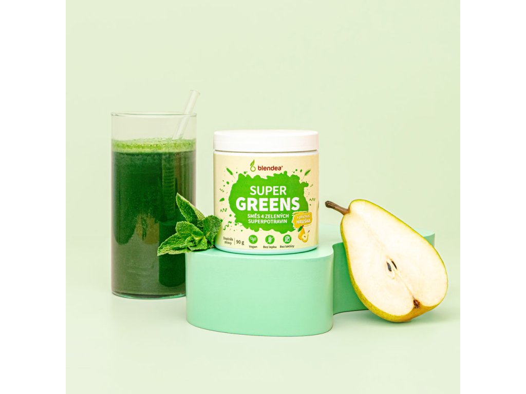 Obľúbené SUPERGREENS s novou príchuťou voňavá hruška. Novinka zachutí každému, komu naša mätová klasika pripadala málo sladká a zaujme každého milovníka jesenných príchutí. | 90 g, 30 dávok