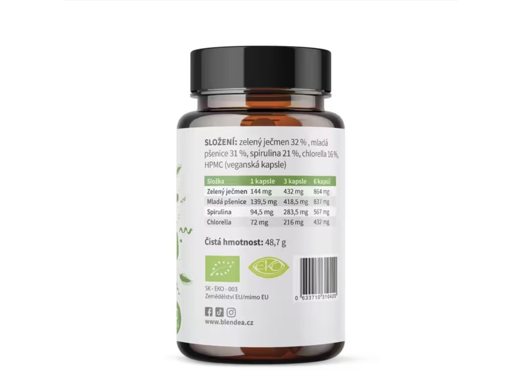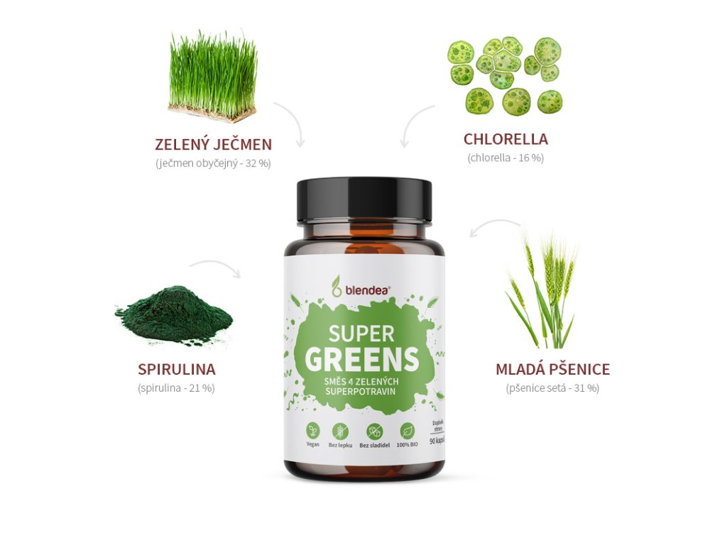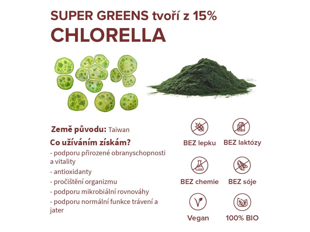 Chlorella, spirulina, mladý jačmeň a zelená pšenica v organickej kvalite. Vyvážená kombinácia 4 zelených superpotravin pre podporu trávenia, imunity, kvality pleti, dodanie energie a prečistenie organizmu. | 90 g, 30 dávok