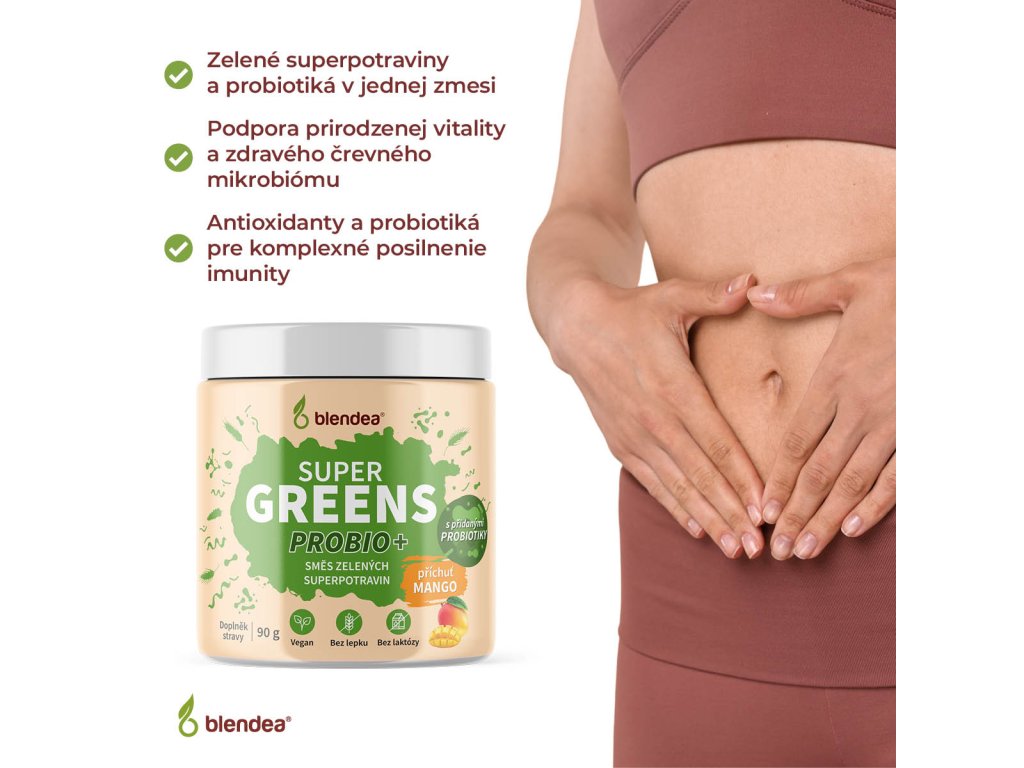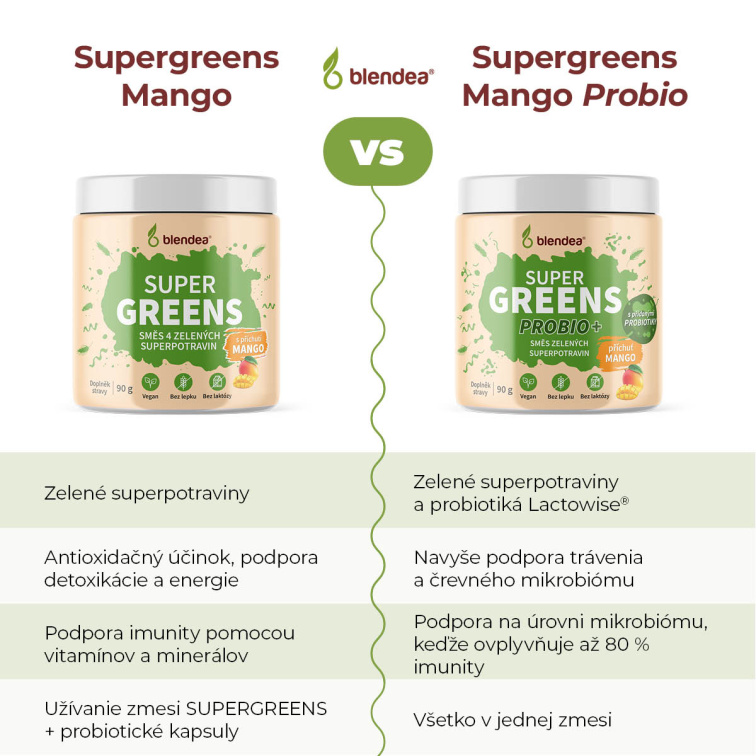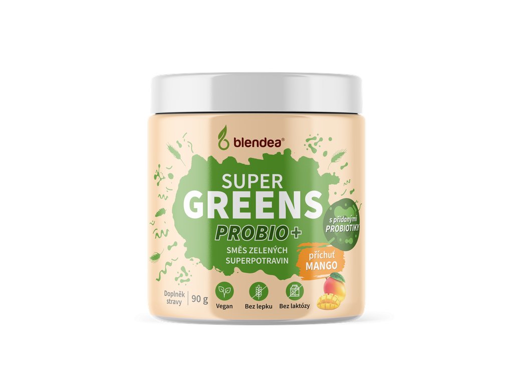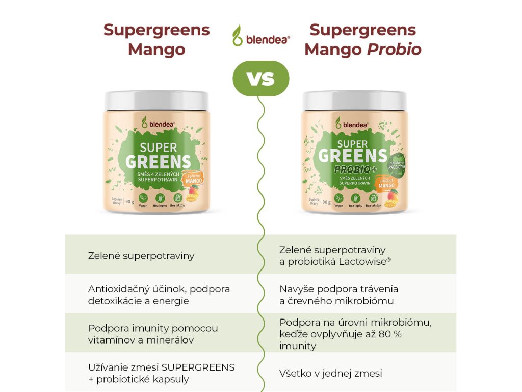 Obľúbené SUPERGREENS obohatené probiotikami s letnou príchuťou šťavnaté mango. Novinka zachutí všetkým, komu sa náš mätový bestseller zdal málo sladký. Mango zaujme milovníkov tropického ovocia. Pridané probiotiká podporujú trávenie, prispievajú imunite a znižujú riziko problémov s pokožkou. | 90 g, 30 dávek