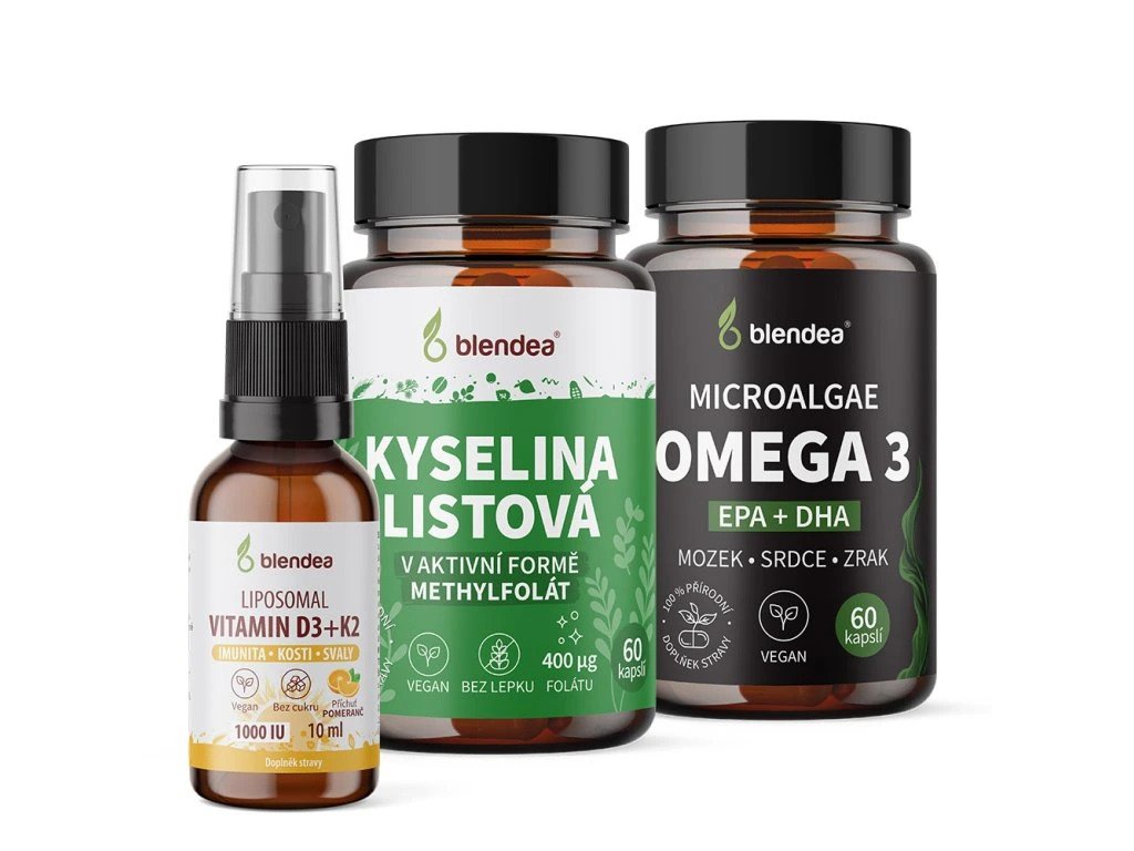 Balíček obsahuje produkty Blendea Kyselina listová (60 kapsúl), Lipozomálny vitamín D3+K2 (10 ml) a Omega 3 mastné kyseliny (60 kapsúl).